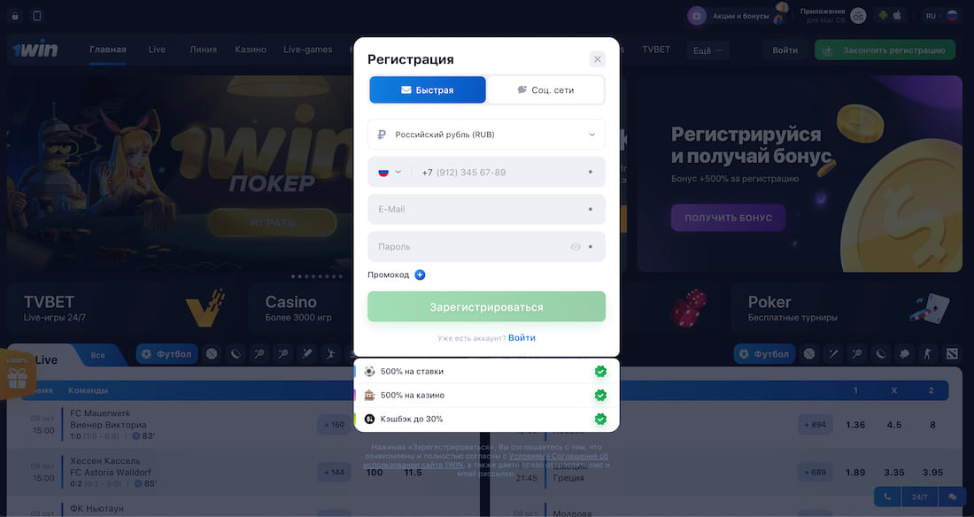 Регистрация в БК 1Вин – это быстрый и удобный процесс, который занимает не более 15 минут. Пройти её можно на официальном сайте (или через актуальное зеркало), а также в мобильном приложении. Платформа предлагает несколько способов регистрации: