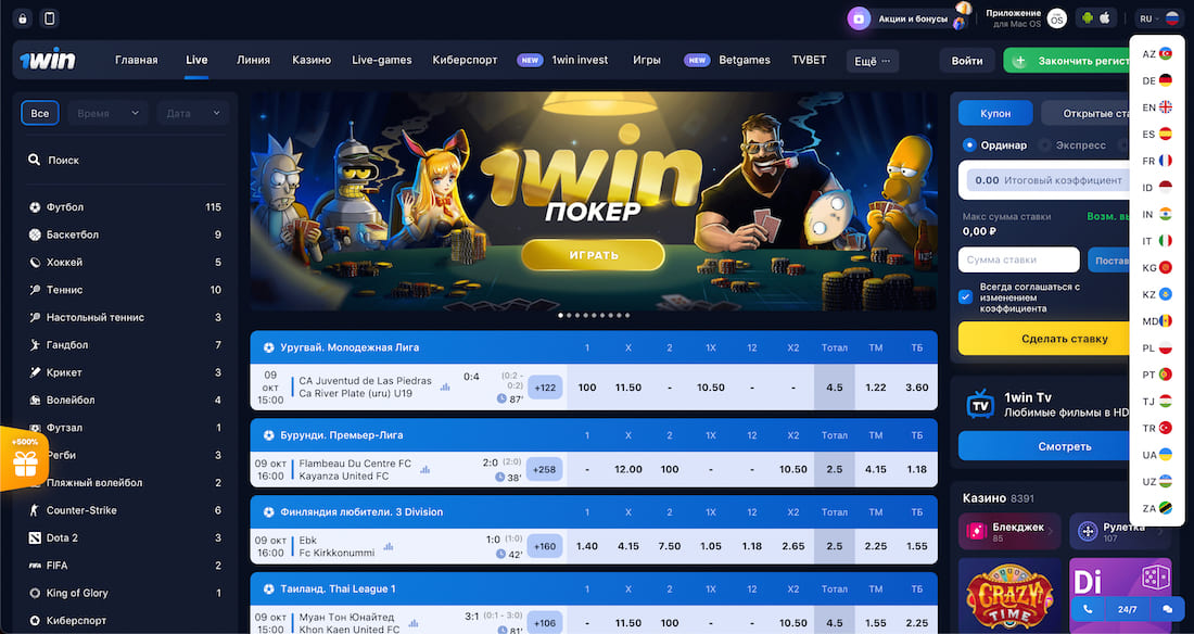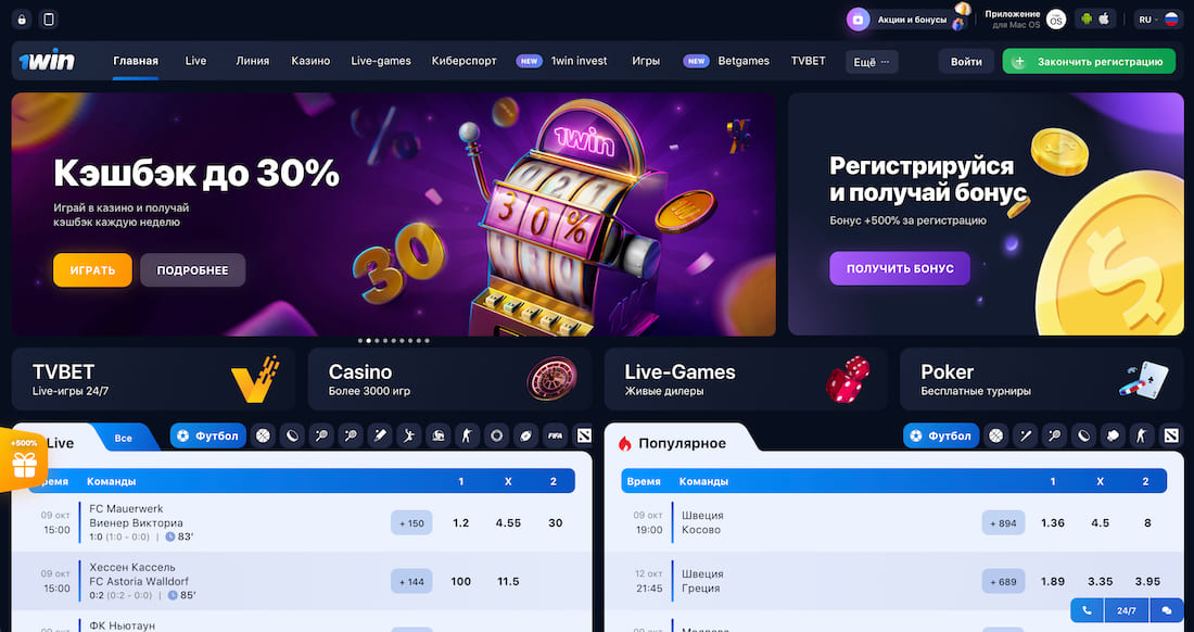 Современный сайт 1Вин выполнен в фирменных тёмно-синих тонах и сочетает в себе как спортивные ставки, так и азартные развлечения, включая слоты, покер и рулетку. Платформа мультиязычная и поддерживает несколько валют, таких как доллары, гривны и евро. Интерфейс отличается простотой и удобством, а мобильная версия сайта адаптирована для всех типов устройств.